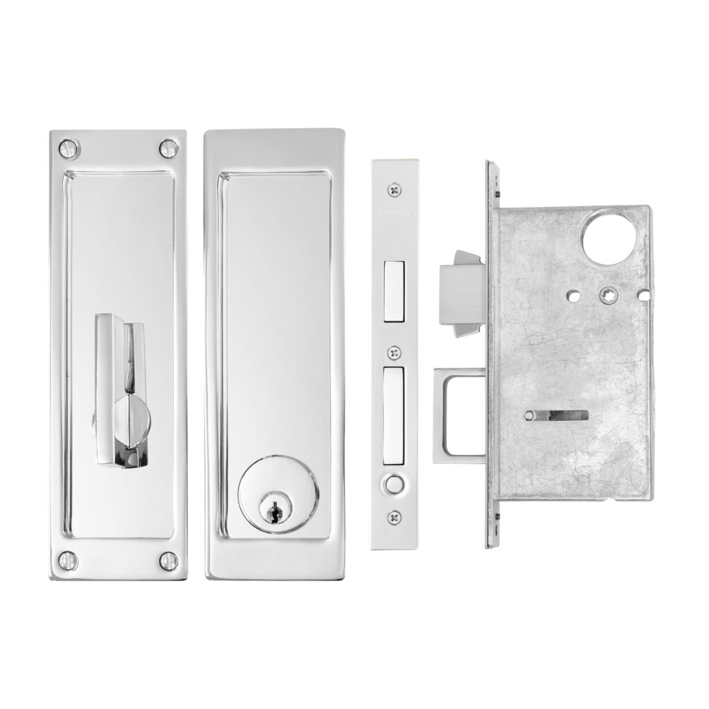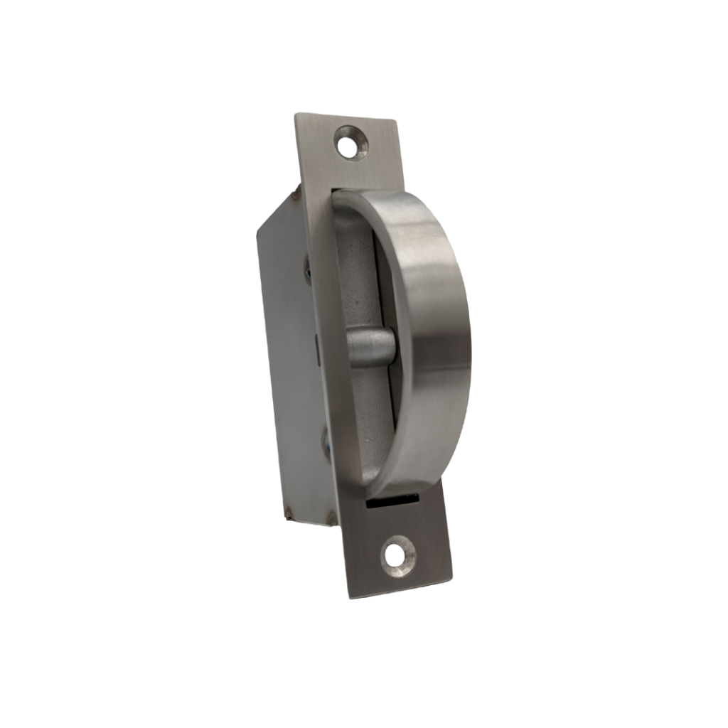 Stainless steel pocket door lock featuring a deep bucket, an extended lip for better grip, and a substantial gauge for a contemporary look. Choose from a variety of security options for a variety of spaces.