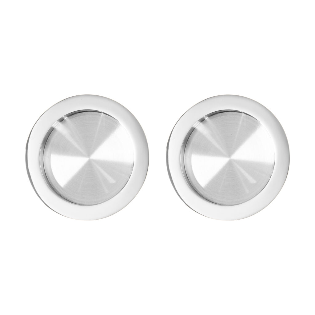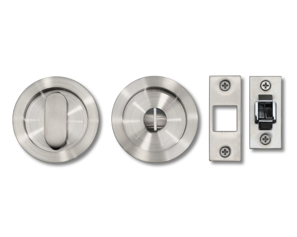 Stainless steel pocket door lock with a round, flush base and extended ADA accessible turn piece. Choose from a variety of security options for a variety of spaces.