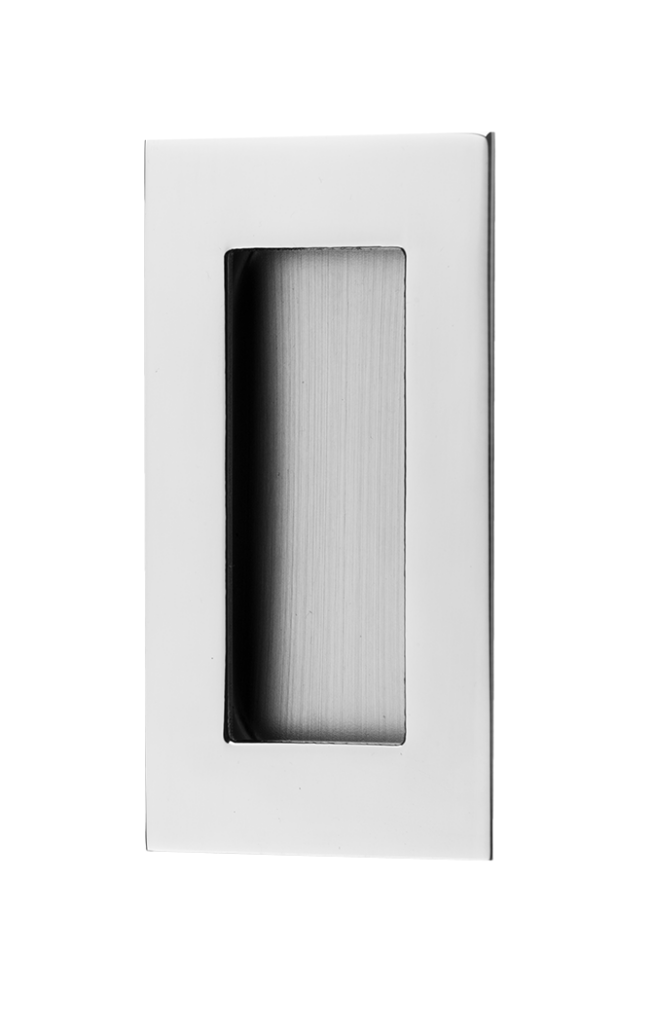 Stainless steel flush pull featuring a deep bucket, an extended lip for better grip, and a substantial gauge.